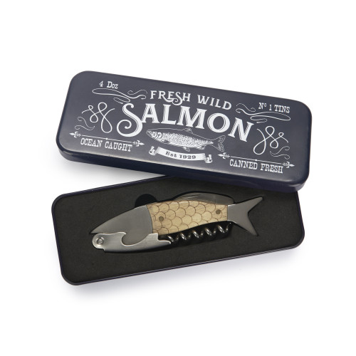 A quirky and practical addition to your kitchen or bar accessory collection. Crafted in the shape of a vibrant salmon, this corkscrew arrives in a striking blue aluminium tin box, making it a perfect gift.